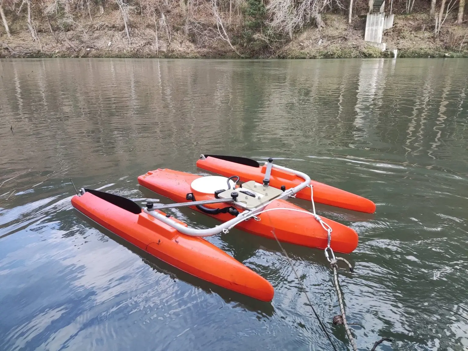 When the stretch and the regime allow it, we deploy a five-beam ADCP (acoustic Doppler profiler) on trimaran, operating in both slow and fast waters and capable of measuring up to 25 m depth. The equipment travels the riverbed from bank to bank and generates a data grid with information on speed, direction and depth in 5×5 cm cells. To consider the gauging valid we applied quality criteria: 4 pairs of transects, a total duration > 720s and a discrepancy < 4% between valid transects.